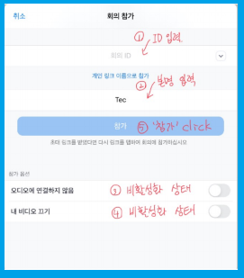 -아래 ‘참가옵션’ 오디오에 연결하지 않음, 내 비디오 끄기(비활성화. 회색 상태)